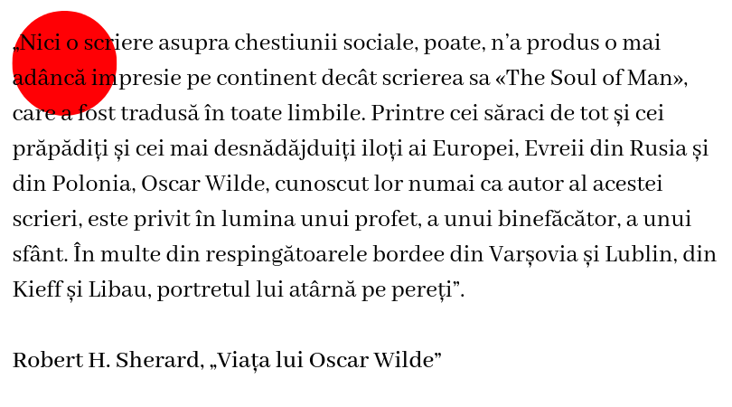 „Nici o scriere asupra chestiunii sociale, poate, n’a produs o mai adâncă impresie pe continent decât scrierea sa «The Soul of Man», care a fost tradusă în toate limbile. Printre cei săraci de tot și cei prăpădiți și cei mai desnădăjduiți iloți ai Europei, Evreii din Rusia și din Polonia, Oscar Wilde, cunoscut lor numai ca autor al acestei scrieri, este privit în lumina unui profet, a unui binefăcător, a unui sfânt. În multe din respingătoarele bordee din Varșovia și Lublin, din Kieff și Libau, portretul lui atârnă pe pereți”.